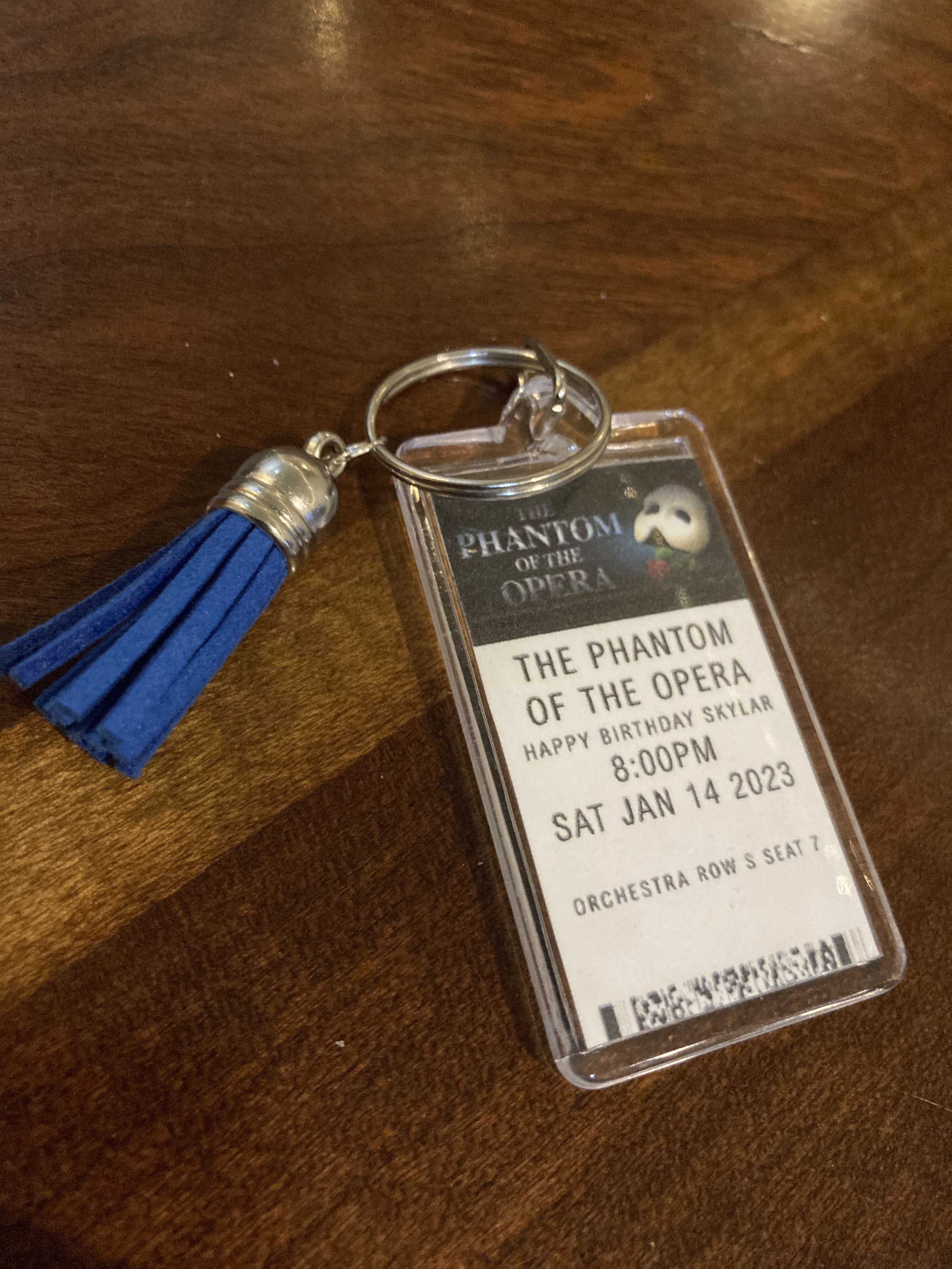 “Thank you,” I said sincerely, extricating it from the tissue paper. It was a small bit of plastic shaped like a ticket with the Phantom of the Opera logo on it. I already owned multiple Phantom shirts, posters, mugs, CDs, DVDs, playbills, and signed mask replicas. But I didn’t have a keychain yet — so I was pleased by the gift, albeit puzzled at everyone watching my face.